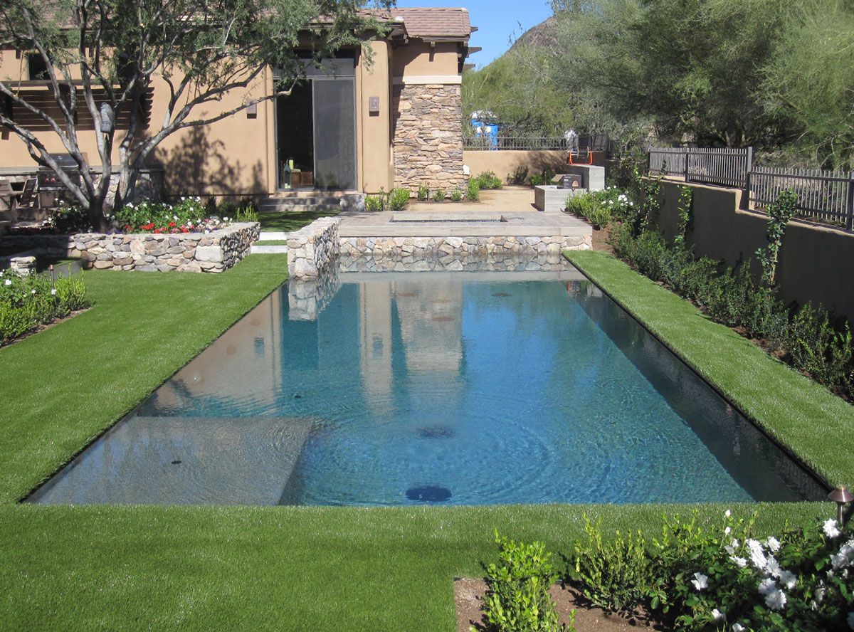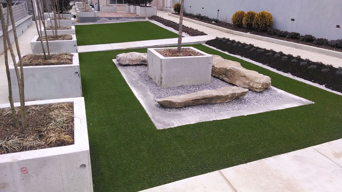 Our Landscape System uses best in class polyethylene synthetic turfs that offer rich, lush turf fibers for comfort and beauty. Installed on a stable and compact base, the area will transform into a perfectly manicured zone with very little maintenance – green all year round, remaining clean and free from unsightly weeds and mud.